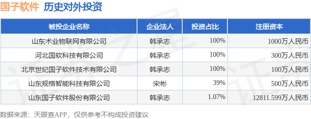 本站消息,根据天眼查APP显示,国子软件(920953.BJ)新增一起对外投资事件,被投资公司为山东术业物联网有限公司易速宝,法定代表人韩承志,投资占比为100%。该公司从事软件和信息技术服务业,注册资本为1000万人民币。目前,国子软件共存在对外投资5项,详见下表: