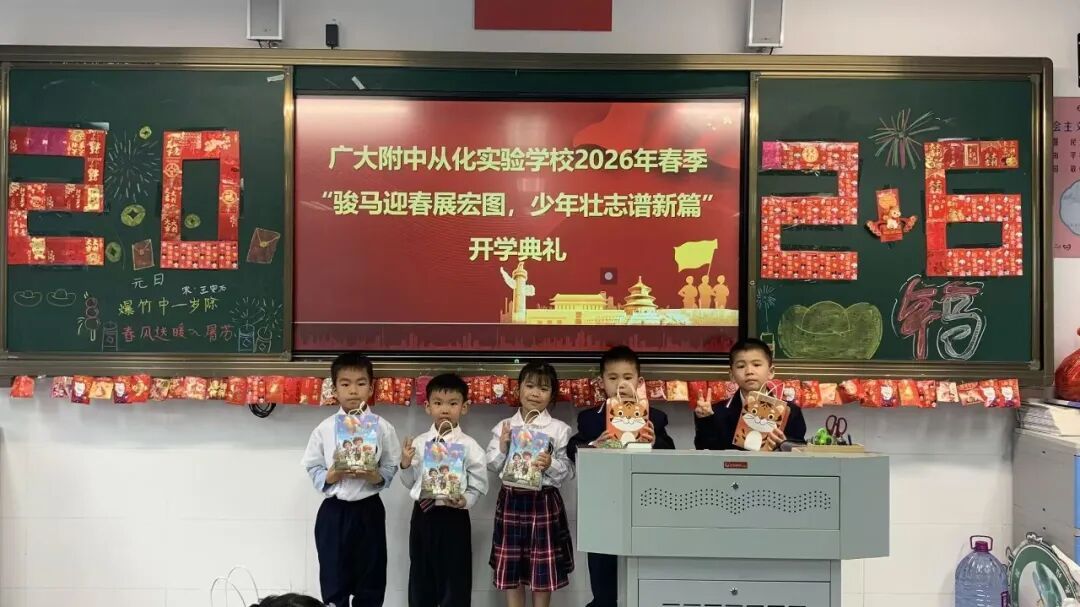 上午8点10分,广州大学附属中学从化实验学校全体师生齐聚校园,举行2026年春季“骏马迎春展宏图,少年壮志谱新篇”开学典礼,用满满的仪式感与暖心好礼,共同迎接新学期的到来。