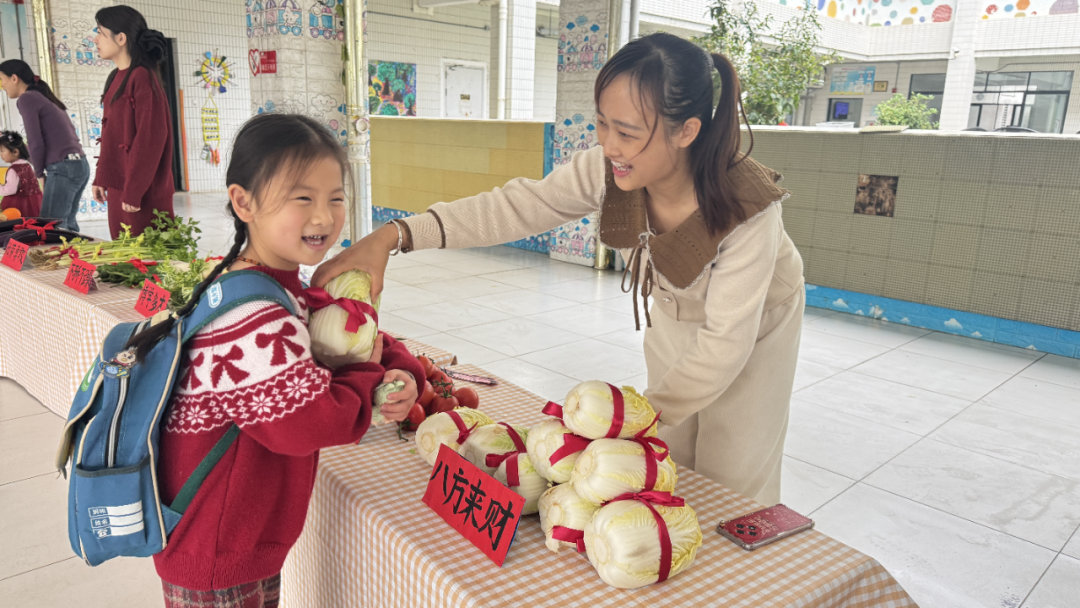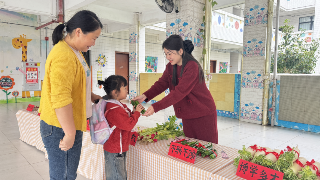 入园后,仪式感持续升级,孩子们依据福签提示领取寓意蔬菜,大葱寄寓聪明伶俐,芹菜象征勤奋好学,这份别致的“蔬菜祝福”,将幼儿园的新学期期许化作触手可及的美好。此外,活动还延伸至家庭,孩子们将“祝福蔬菜”带回家,与家人携手烹制成美味佳肴,让幼儿园的特色课程在亲子互动中延续,碰撞出劳动的喜悦与亲情的温馨。