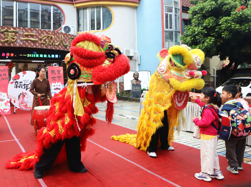 老师们还精心准备了趣味欢迎仪式,不仅为每个小朋友准备了一颗苹果,还在校门口舞狮、打鼓,狮子时不时凑到小朋友身边蹭蹭他们的小脸蛋,惹得孩子们咯咯直笑,纷纷伸出小手去摸狮子的绒毛。