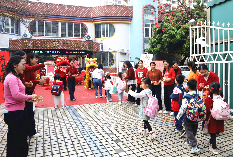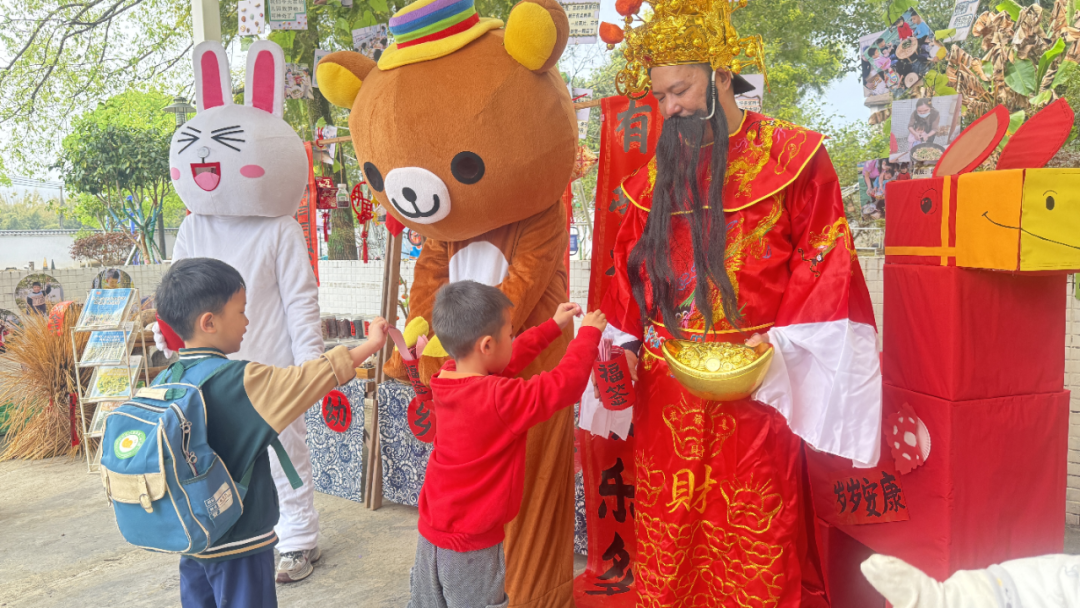 而在吕田镇第二幼儿园,这里张灯结彩,红灯笼相映成趣,“财神爷”“小白兔”“小熊”等卡通形象早早迎候,为入园宝贝们派发福签,孩子们抽取新年幸运的欢笑声,奏响了开学序曲。