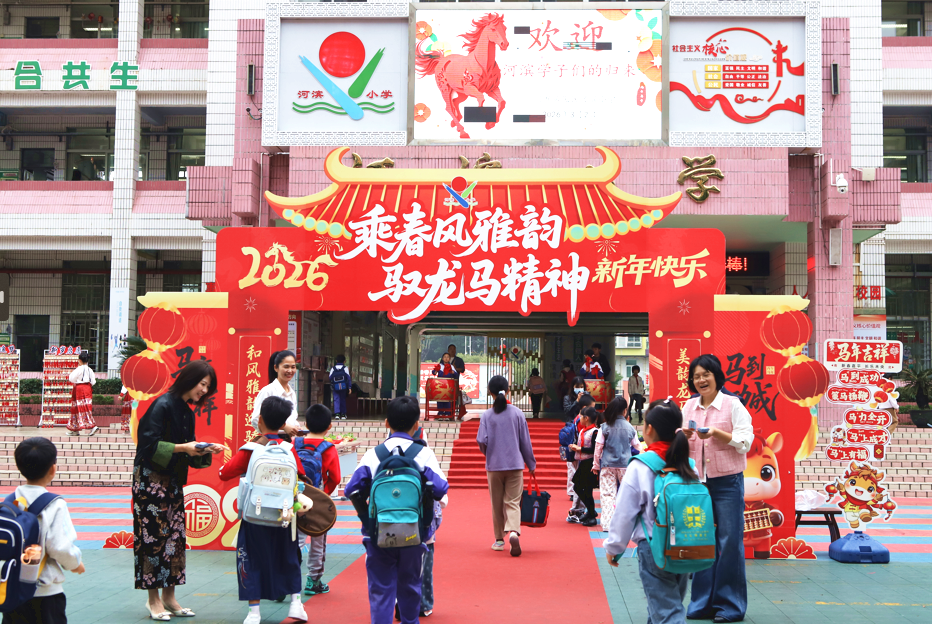 学校精心准备了“开学迎新”惊喜。校门口,印有“乘春风雅韵 驭龙马精神”“2026新年快乐”等字样的新春拱门下,几位老师站在两旁,笑着向每一位入校的学生递上开学书签;穿过拱门,苹果、生菜、橙子、葱、芹菜等果蔬摆放在校道两旁,寄语学生岁岁安康、生生不息、心想事成;鼓手们用节奏十足的声音,敲出欢快的迎宾鼓点,每一次鼓槌落下都像是在为孩子们的新学期加油助威;大小“书法家”则在一旁挥墨写福字,再由志愿者为学生“送福”。