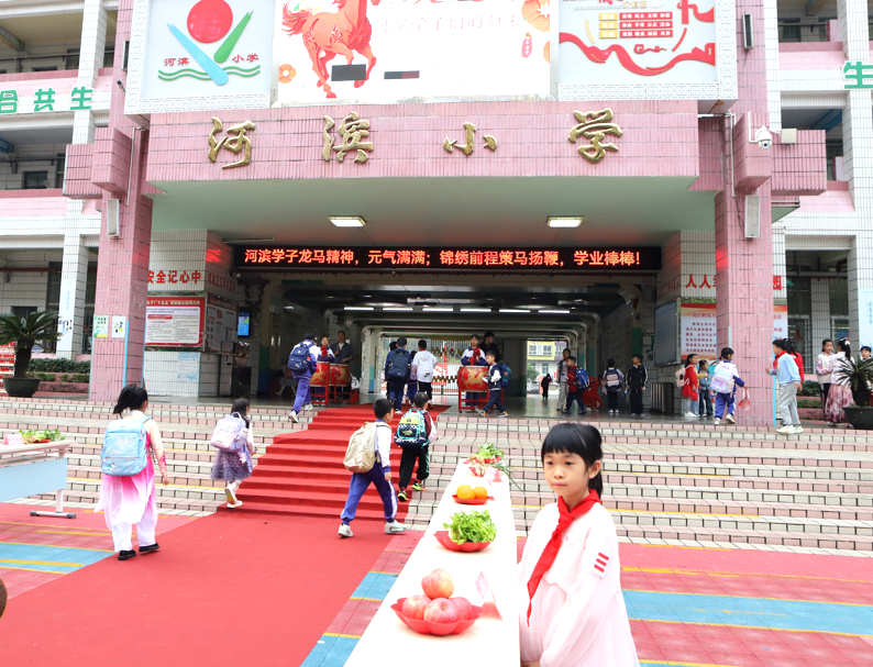 上午7点40分左右,河滨小学门口,学生们带着新春的喜悦与对新学期的憧憬,有序走进校园。