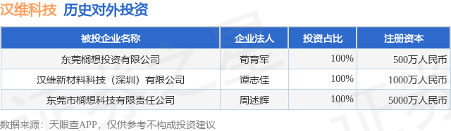 本站消息盈富忧配,根据天眼查APP显示,汉维科技(920957.BJ)新增一起对外投资事件,被投资公司为东莞榈想投资有限公司盈富忧配,法定代表人荀育军,投资占比为100%。该公司从事商务服务业,注册资本为500万人民币。目前,汉维科技共存在对外投资3项,详见下表: