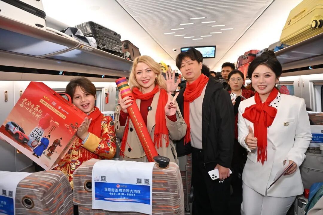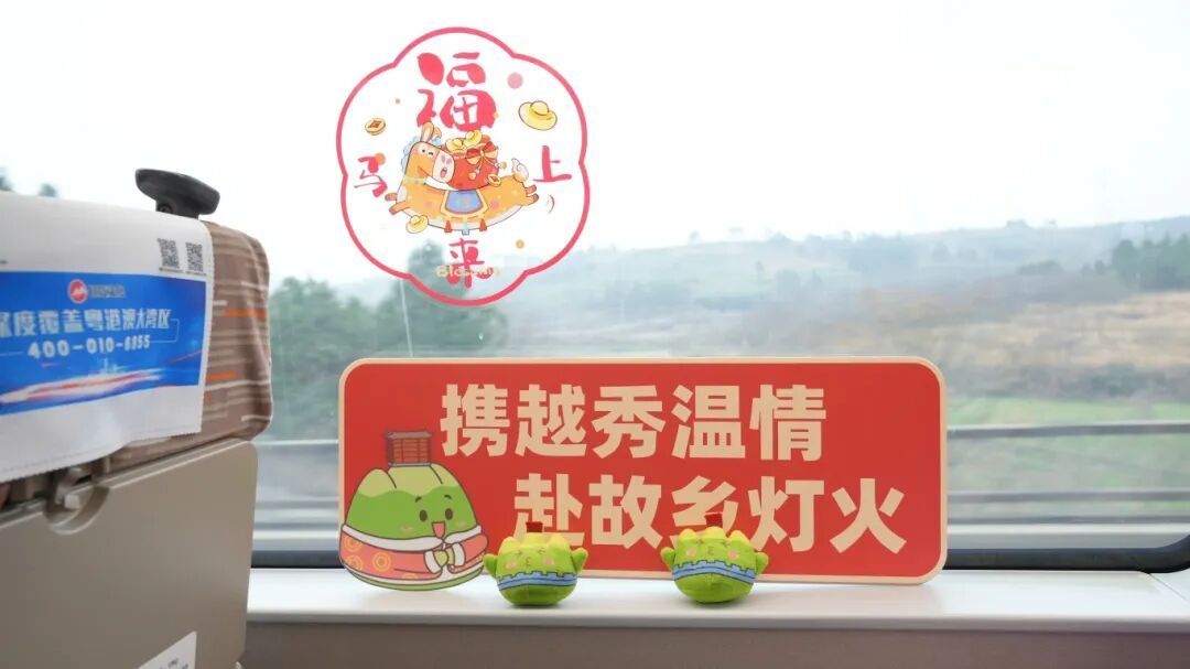 列车缓缓驶离站台,一个充满年味的“移动客厅”就此生动呈现。车厢内,车窗贴、头枕片、小桌板、行李架等处都巧妙融入了春节元素,营造出温馨如家的乘车氛围。乘客陆续登车时,身着制服的“动姐”带着两位小朋友在车厢口与大家轻轻击掌,一声声“欢迎回家”“旅途吉祥”,让踏上归途的脚步更添暖意。